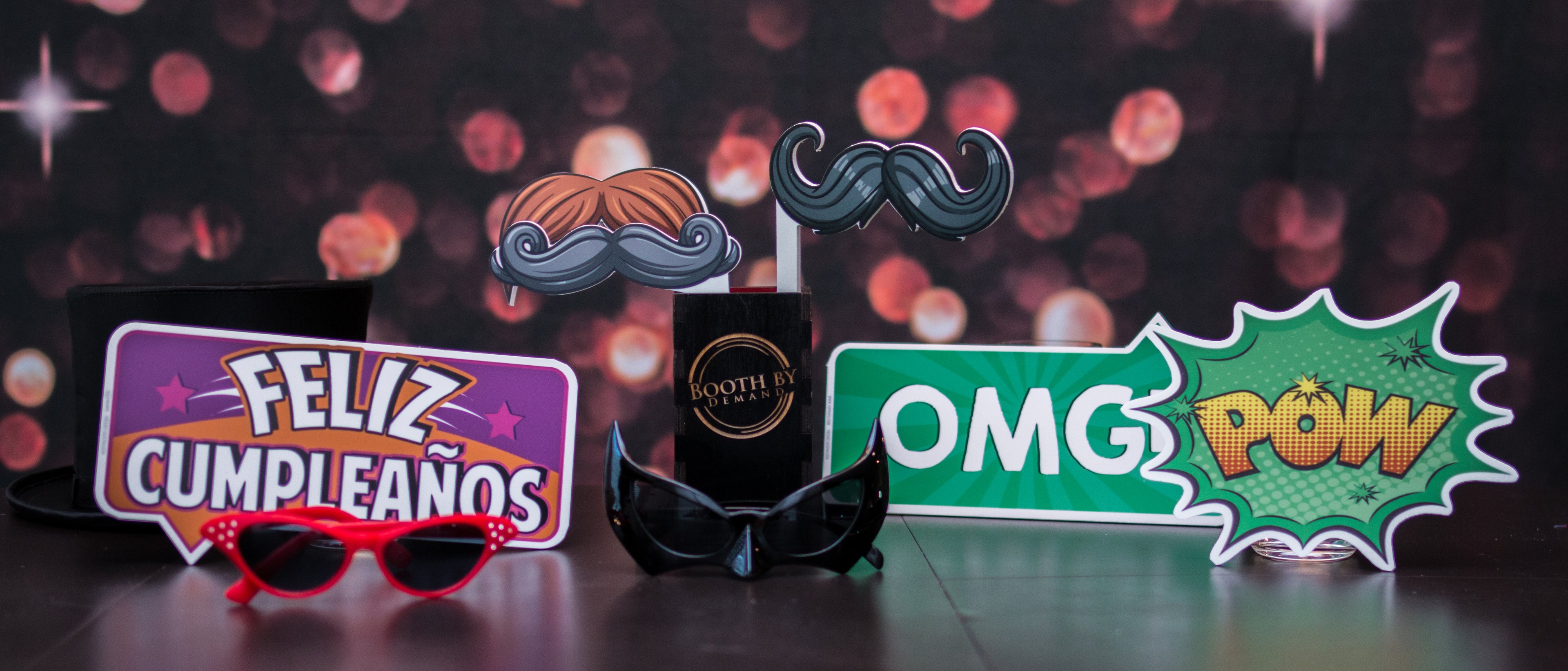 Each of our themed prop packages includes 15-20 items. Including mustaches on sticks, fun double sided signs, party glasses, etc.
